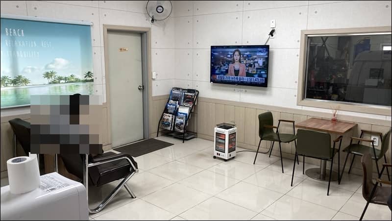 그리고 한켠에 고객대기실이 있는데, 깔끔합니다. 어떤곳은 고객대기실이라고 부르기도 뭣한 장소들이 많던데, 여기는 실내에 난로도 켜져있고 잡지나 TV도 편하게 보면서 대기할 수 있도록 되어있습니다.