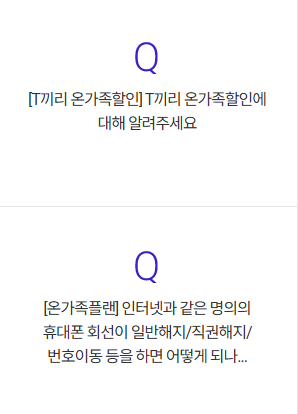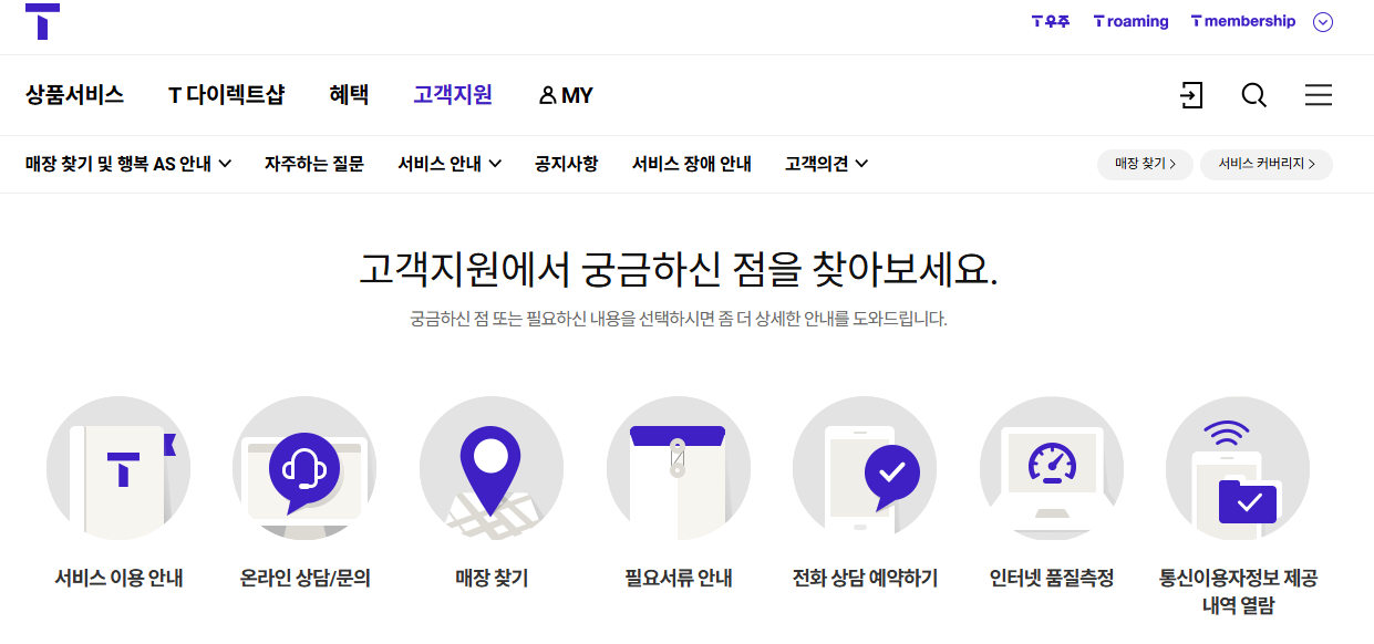 - 로그인 후 상담 신청: T아이디로 로그인 후 고객센터 메뉴에서 채팅 상담을 신청하거나 FAQ를 통해 자주 묻는 질문을 확인할 수 있습니다.