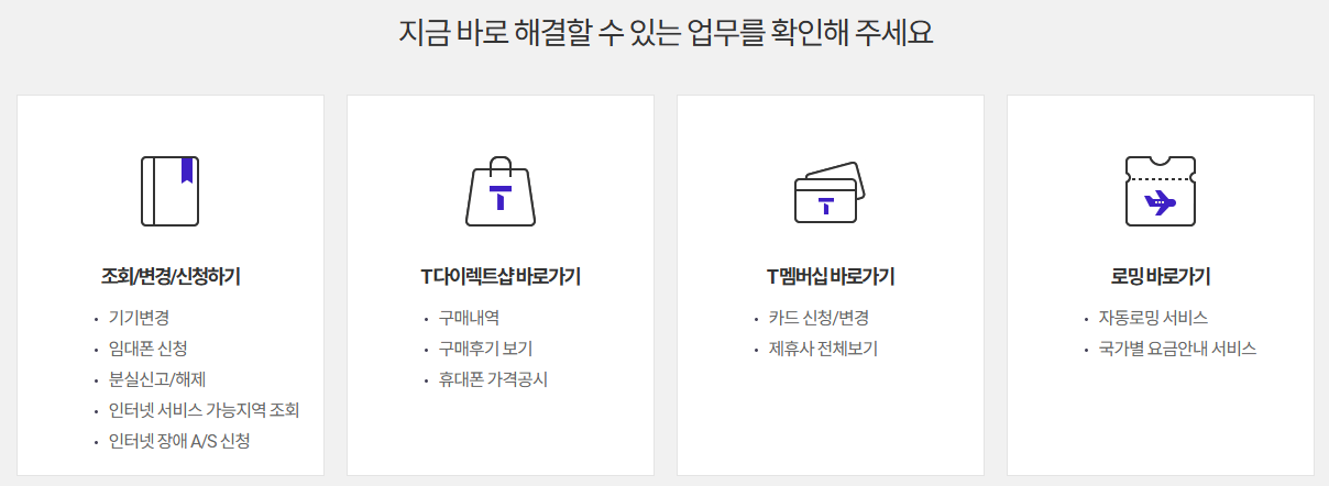 | SKT 공식 홈페이지 | SKT 홈페이지 | 요금 확인, 결제 관리, 상품 변경, 채팅 상담 등 |