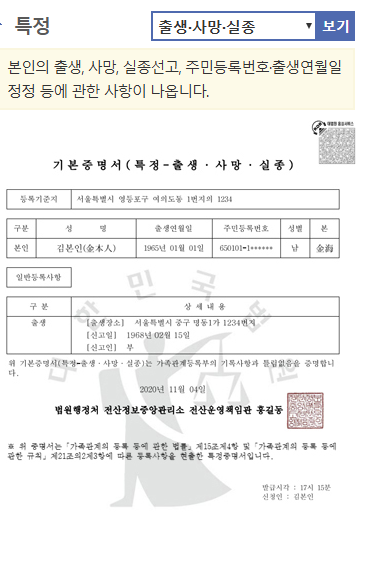 | 특정 기본증명서 | 특정 사건(개명, 국적 변경 등)에 관한 정보만 포함됩니다. 필요한 특정 정보만 선택하여 발급할 수 있습니다. |