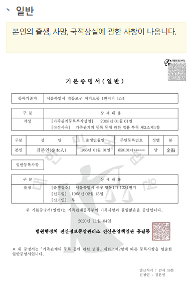 | 일반 기본증명서 | 기본적인 본인 정보만 포함되어 있습니다. 본인의 성명, 출생, 국적, 성별 등이 기재됩니다. |
