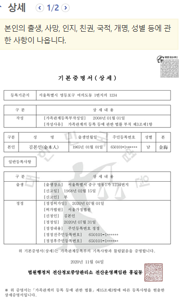 | 상세 기본증명서 | 출생, 개명 이력 등 본인과 관련된 자세한 정보를 포함합니다. 국적 변경 및 가족관계 등록사항이 모두 표기됩니다. |