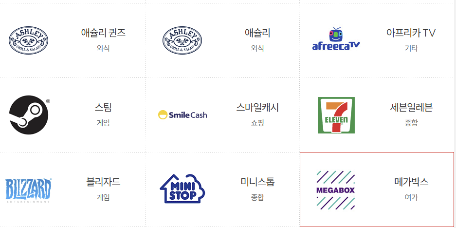 | 영화 | CGV, 롯데시네마, 메가박스 | 영화 예매 및 팝콘 등 부대상품 구매 |