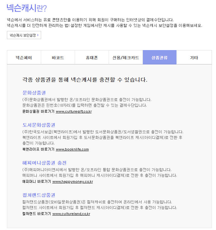 | 게임 | 넥슨, 엔씨소프트, 카카오게임즈 | 게임 캐시 충전, 인앱 아이템 구매 |
