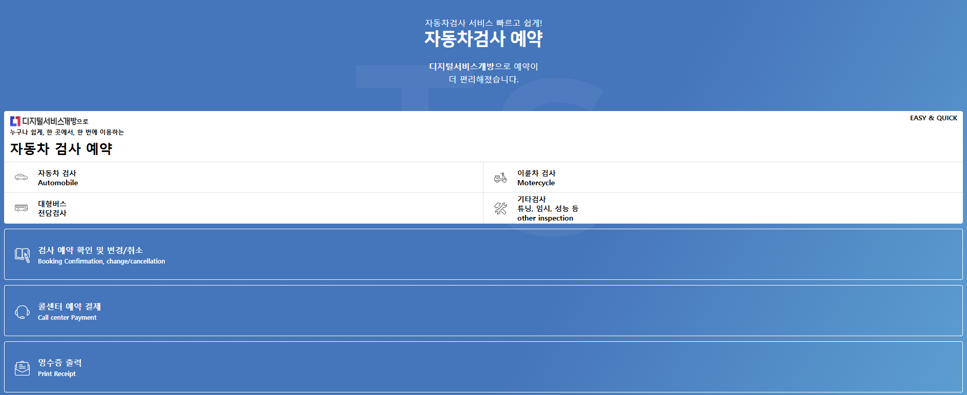 | 인터넷 예약 | 차량정보 및 소유자 정보를 입력해 온라인으로 예약 | 24시간 예약 가능, 대기 시간 단축 |