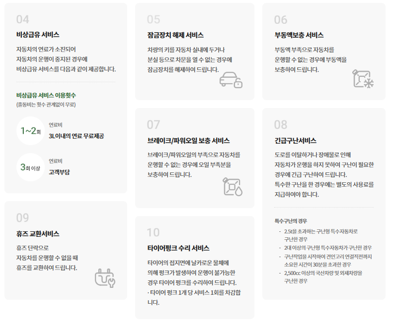 - 출동 서비스 항목: 배터리 방전, 타이어 펑크, 연료 보충, 차량 견인 등의 서비스가 포함됩니다.