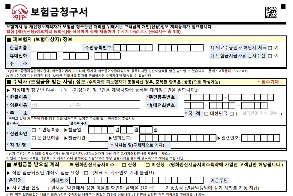 AIA생명 보험금 청구서는 보험금을 지급받기 위해 필요한 가장 기본적인 문서입니다. 보험에 가입한 피보험자가 질병이나 사고로 인해 치료를 받았거나, 재해 또는 사망 등의 사유로 보험금 지급 사유가 발생했을 때, 이를 증명하고 AIA생명에 청구하는 절차에서 사용하는 문서이지요. 이 서류는 보험금 청구인의 인적 사항, 사고 발생 내용, 지급 요청 계좌 등 필수 정보들이 포함되어야 하며, 청구서 외에도 진단서나 영수증 등 보조 자료를 함께 제출해야 보험금 심사가 원활하게 이루어집니다.