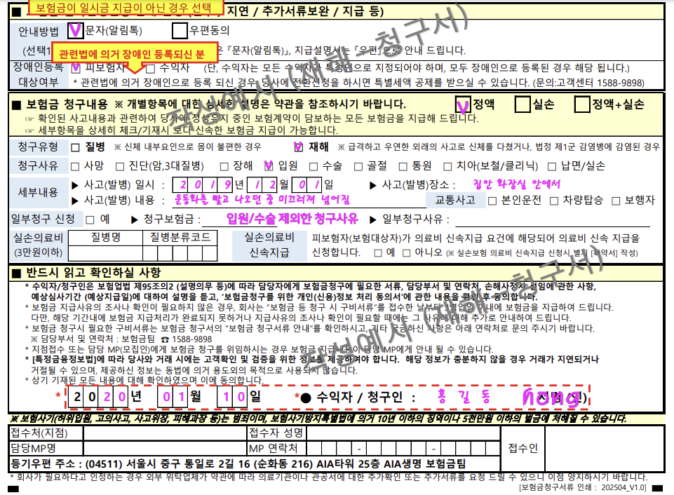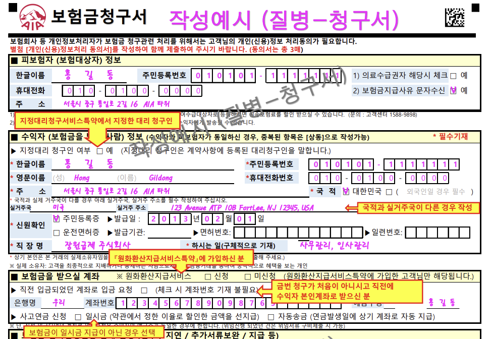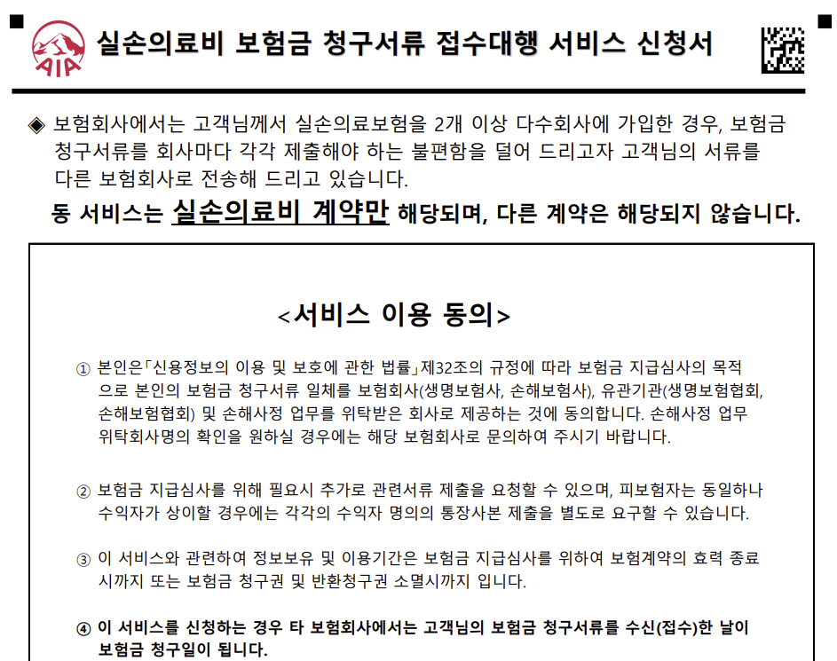 - 우편 제출: (우)04511 서울특별시 중구 통일로 2길 16, AIA타워 25층 보험금 접수팀 앞으로 등기 우편 발송.