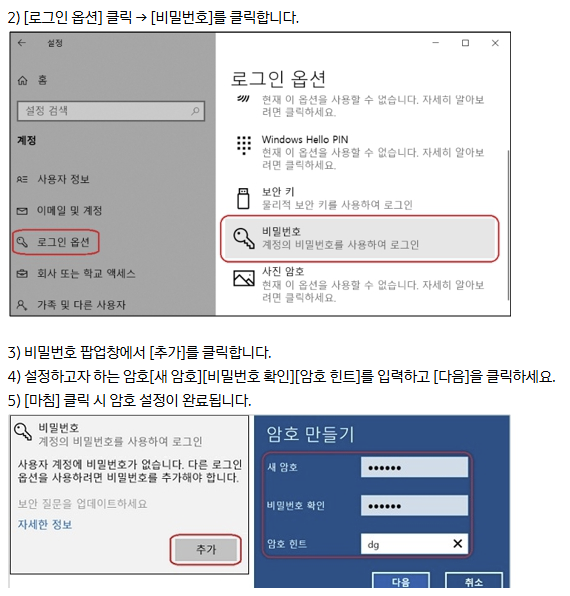 단, 회사용 컴퓨터이거나 가족 구성원들과 함께 사용하는 경우에는 보안을 위해 암호를 유지하는 것이 안전합니다. 항상 자신이 사용하는 컴퓨터의 사용 환경과 필요에 맞춰 설정을 조절하시기 바랍니다. 언제나 보다 편리하고 안전한 컴퓨터 사용이 되시길 바랍니다.
