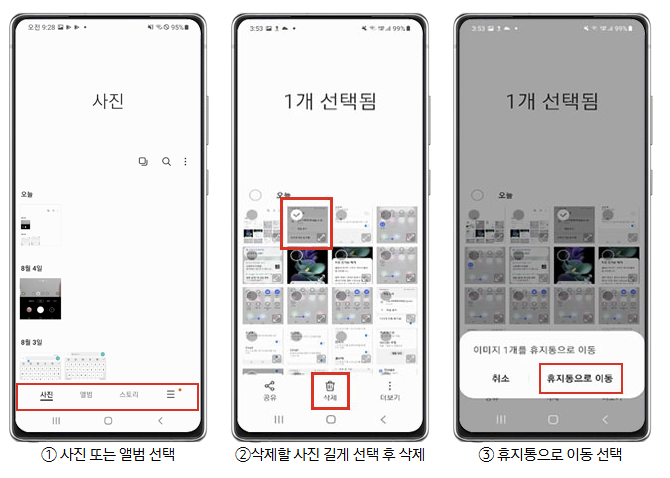 삼성 갤럭시, LG, 샤오미 등의 기본 갤러리 앱에서는 삭제된 사진과 영상을 별도로 보관하는 휴지통 기능이 존재합니다. 다음 절차로 복원할 수 있습니다.