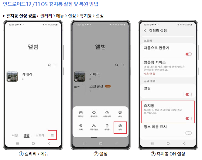 | 안드로이드 갤러리 | 갤러리 앱 | ⋮ → 휴지통 | 사진, 영상 | 30일 |