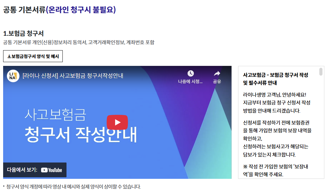 양식을 다운로드하려면 라이나생명 홈페이지(www.lina.co.kr)에 접속한 뒤, 상단 메뉴에서 '고객센터' → '보험금 청구 안내'로 들어갑니다. 이 메뉴에서는 보험금 청구에 필요한 공통 서류, 양식, 유의사항을 함께 확인할 수 있습니다. ‘보험금 청구서’를 클릭하면 PDF 형식의 최신 청구서를 다운로드할 수 있으며, 직접 작성하거나 인쇄하여 수기로 작성해도 무방합니다.