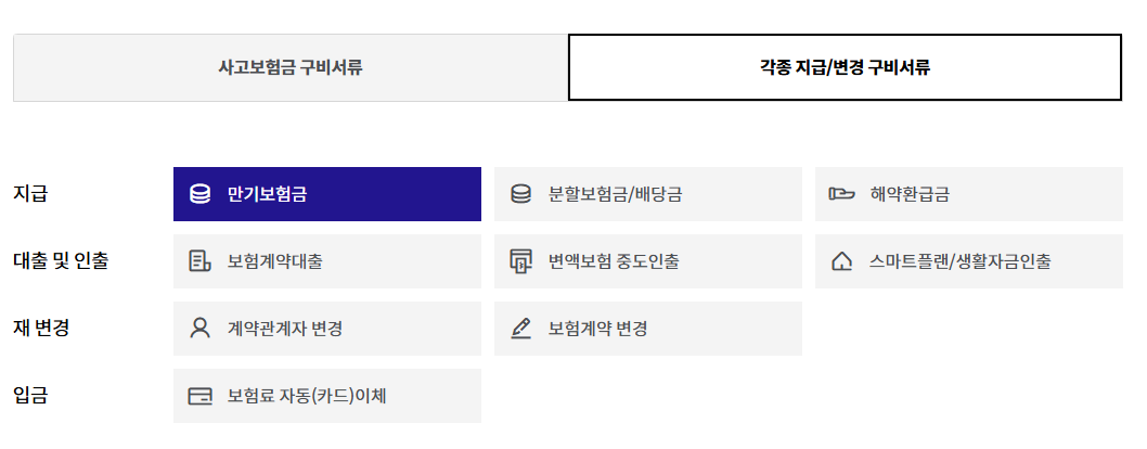 - 사망보험금: 사망진단서, 기본증명서, 가족관계증명서, 수익자 인감증명서